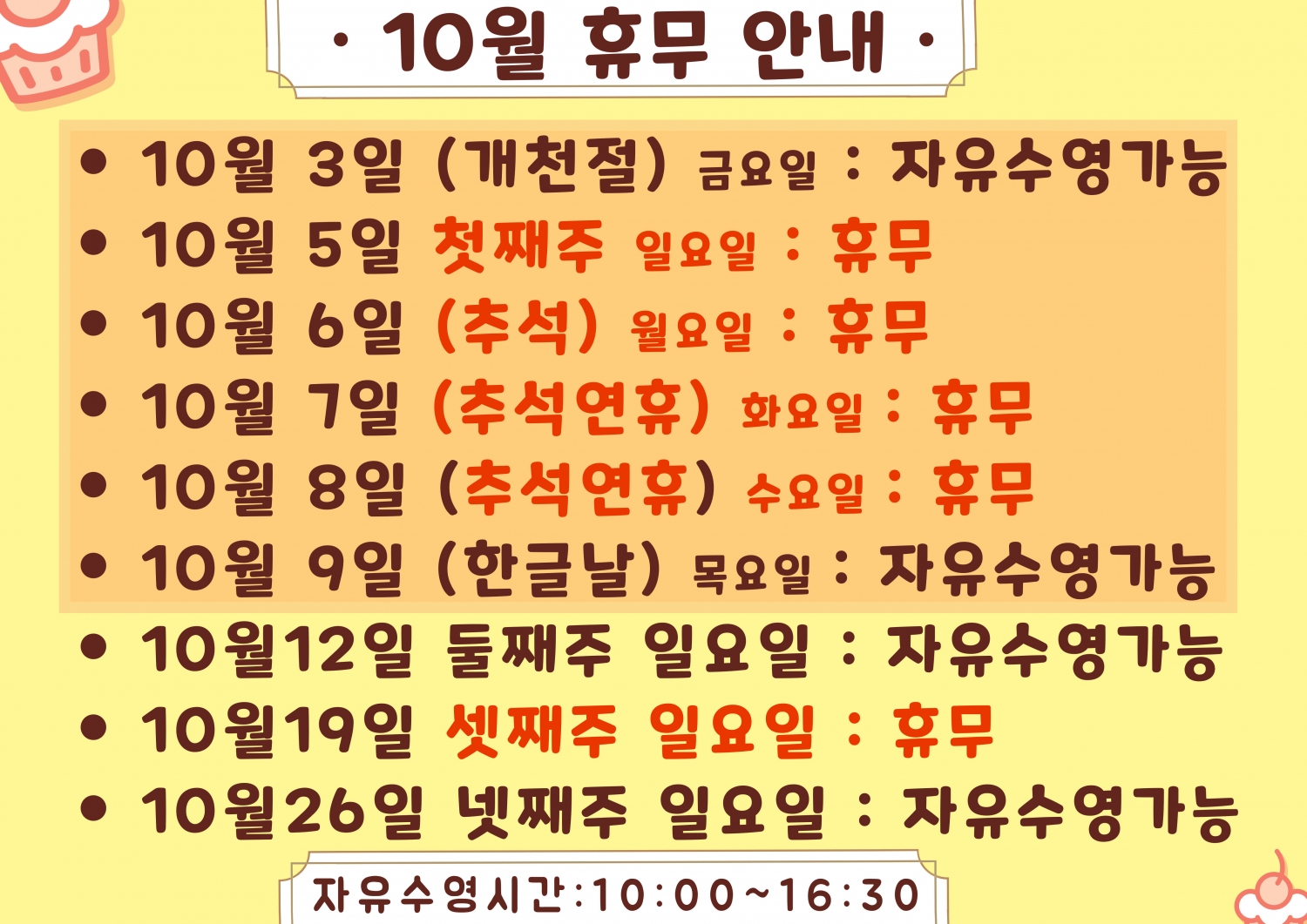 10월 휴무안내 입니다.